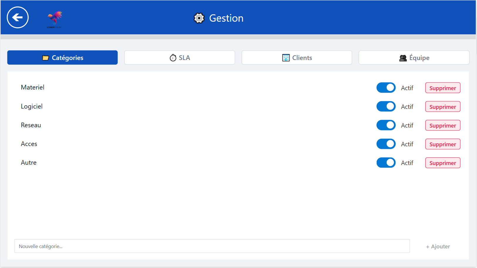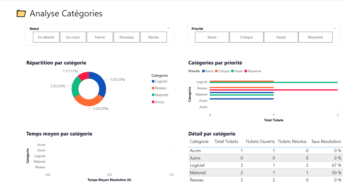 4 pages : vue ensemble, SLA, équipe, catégories.