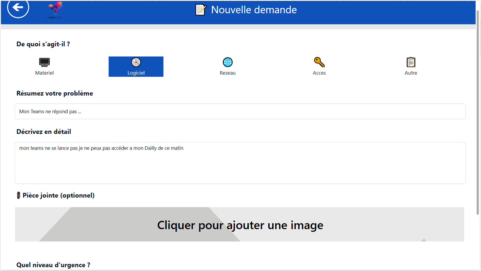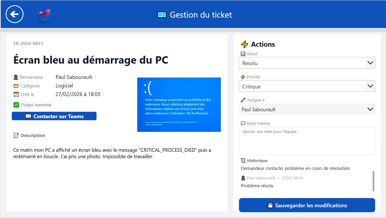Vous gérez votre propre support IT. Le champ "client" est automatiquement masqué. Interface simple et épurée.