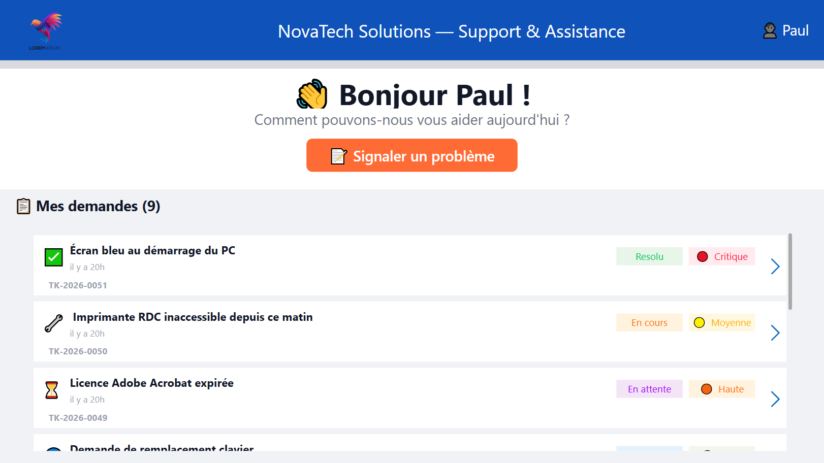 Chaque demande a un ticket, un statut et un historique. Plus rien ne se perd.